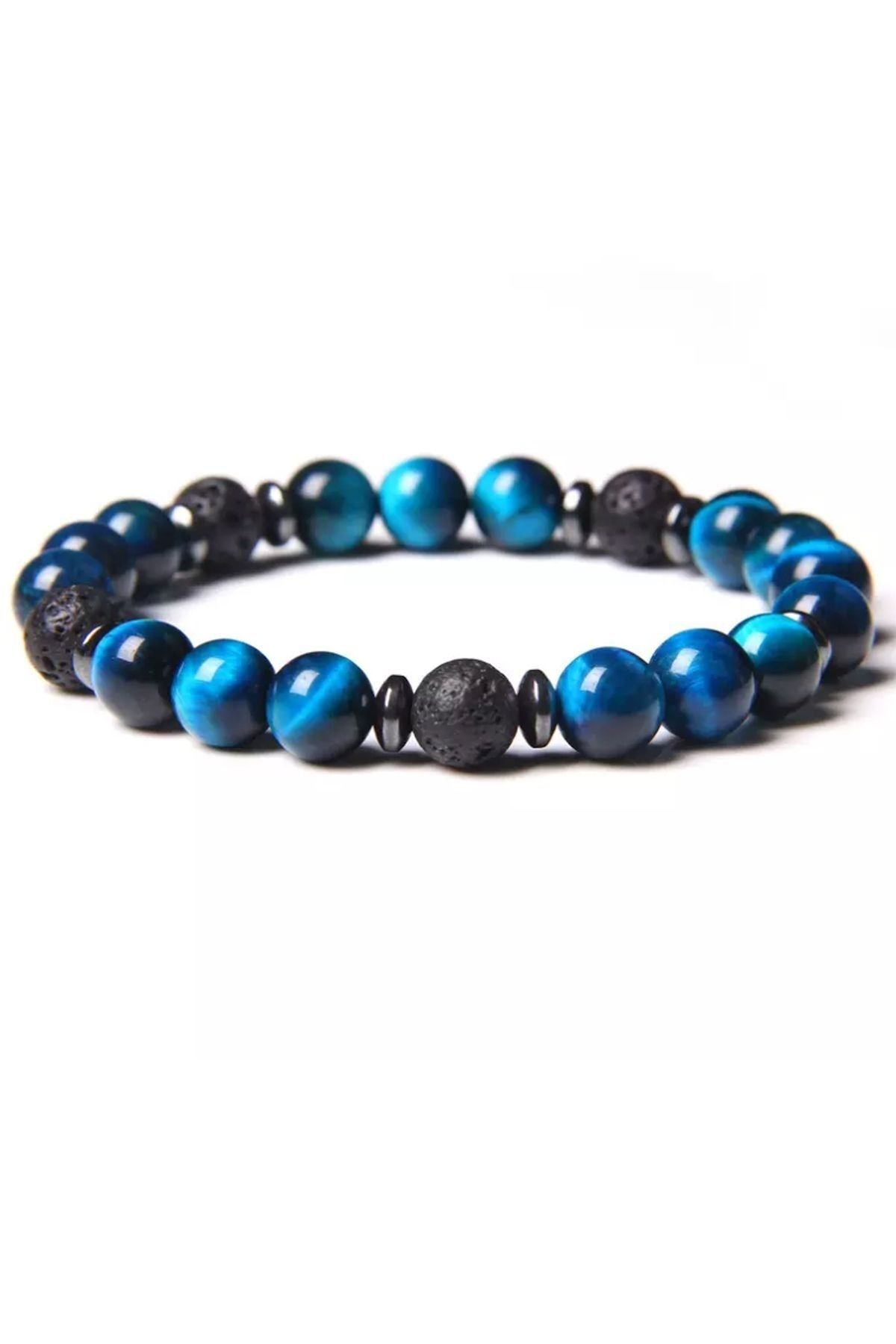 Taşlar ortalama 8mm dir. ; Elastik ip üzerine dizilidir, Siyah olanlar lav, maviler kaplangözü, silindir şeklinde olan griler hematit taşıdır. ; L/XL erkek için, S/M kadın içindir.;
